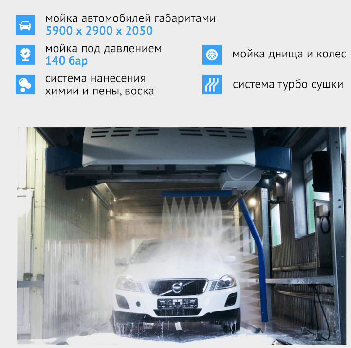 Автомобиль моется бесконтактным способом, не повреждая лакокрасочное покрытие автомобиля. Мойка осуществляется давлением 160 бар вертикальными Г-образными и горизонтальным рукавами.